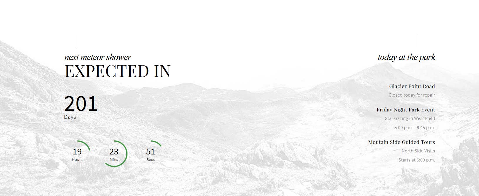 The countdown timer will show up in the bottom_row1_1 position. You can change all the settings for it in the Theme Specific area of Vertex. There is a custom HTML module published to the bottom_row1_1 position with a module class suffix of "titleleft". The title (next meteor shower expected in class=hide_580) of it includes a responsive hide class so that this module is hidden at 580 screen width when the countdown timer is also hidden. The module on the right is a standard Joomla newsflash module published to the bottom_row1_2 position with a class suffix of "titleright".